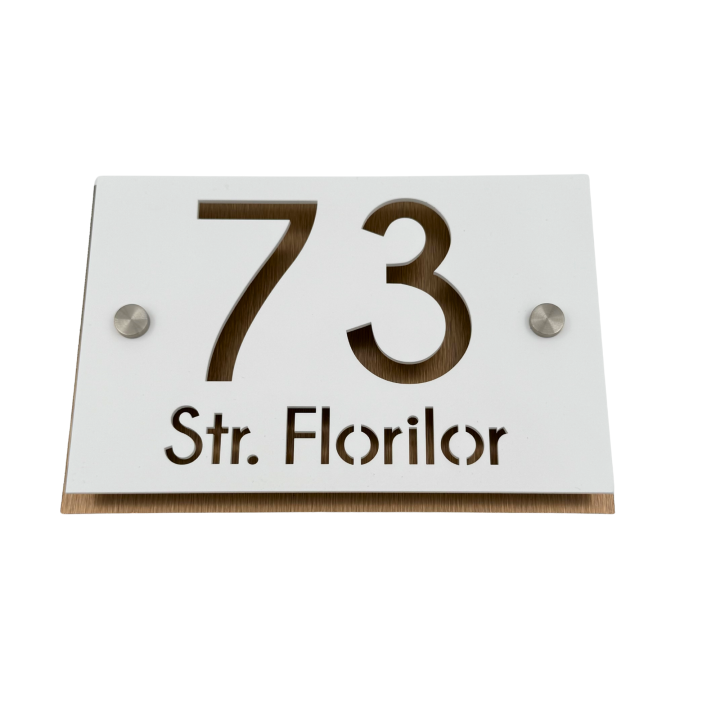 Alegeți plăcuța noastră deosebită pentru număr și adresă și transformați casa sau gardul dumneavoastră într-o adevărată operă de artă. Cu un design luxos și extravagant, această piesă va adăuga un plus de valoare și stil locuinței dumneavoastră, reflectând gustul și personalitatea dumneavoastră excepțională.