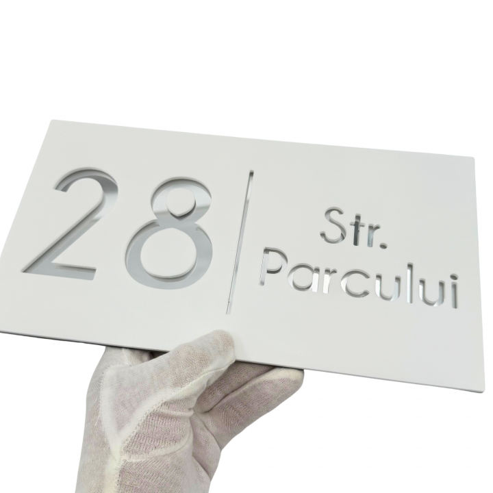 NUMAR CASA PREMIUM - Alb Satinat / Argintiu Oglinda - 28x15cm