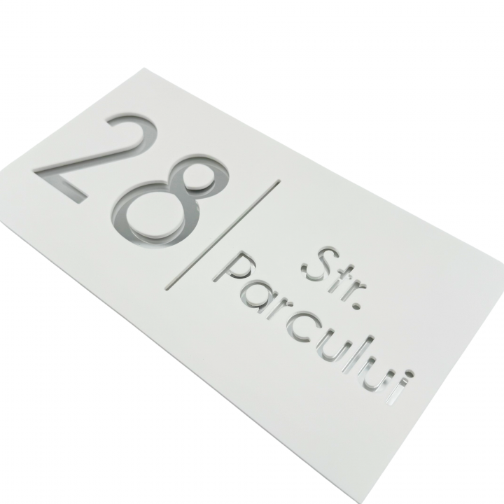 Plăcuța noastră luxoasă și extravagantă este realizată din plexiglas de cea mai înaltă calitate, cu o grosime de 6 mm, pentru a vă oferi o durabilitate și rezistență de neegalat. Fiecare număr și adresă sunt gravate cu precizie și atenție, pentru a crea un efect vizual impresionant și sofisticat.