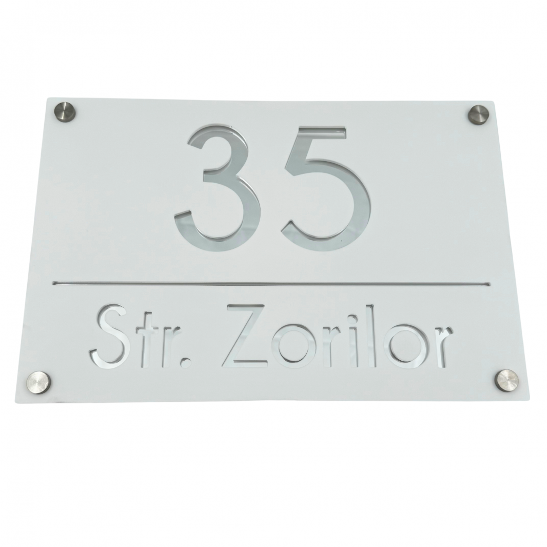 Plăcuța noastră luxoasă și extravagantă este realizată din plexiglas de cea mai înaltă calitate, cu o grosime de 6 mm, pentru a vă oferi o durabilitate și rezistență de neegalat. Fiecare număr și adresă sunt gravate cu precizie și atenție, pentru a crea un efect vizual impresionant și sofisticat.