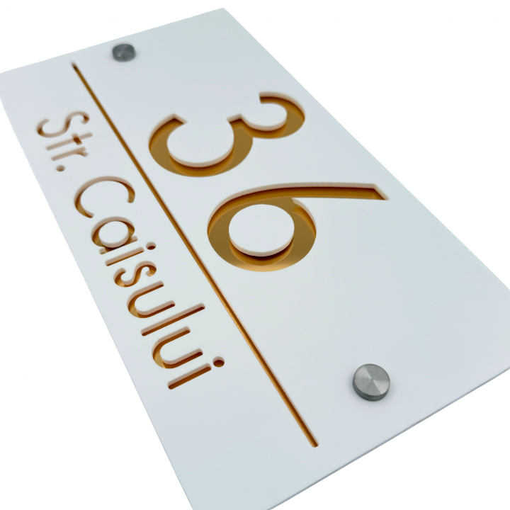 Plăcuța noastră luxoasă și extravagantă este realizată din plexiglas de cea mai înaltă calitate, cu o grosime de 6 mm, pentru a vă oferi o durabilitate și rezistență de neegalat. Fiecare număr și adresă sunt gravate cu precizie și atenție, pentru a crea un efect vizual impresionant și sofisticat.