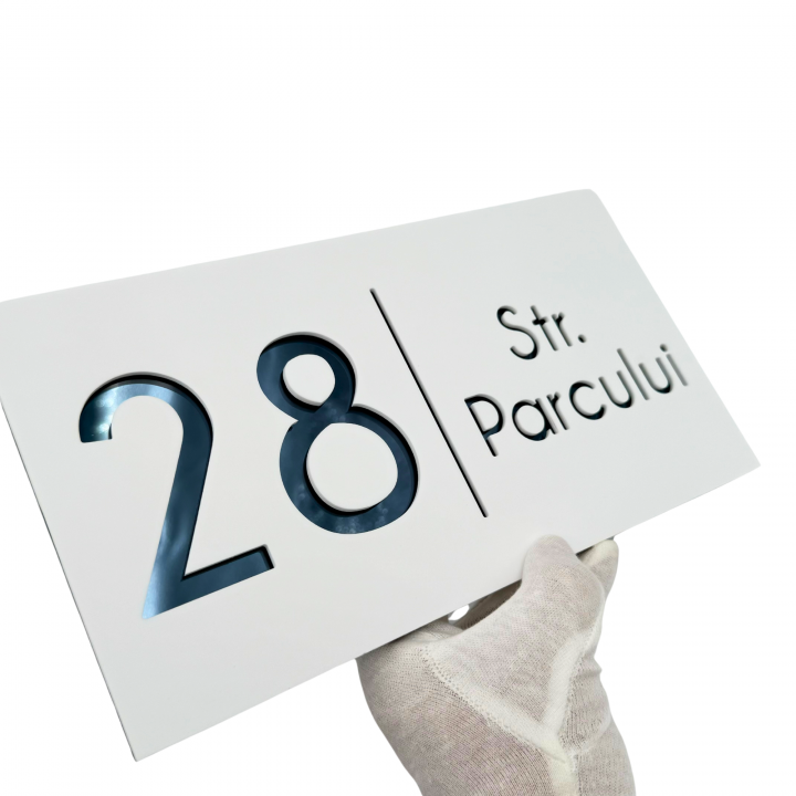 Plăcuța noastră luxoasă și extravagantă este realizată din plexiglas de cea mai înaltă calitate, cu o grosime de 6 mm, pentru a vă oferi o durabilitate și rezistență de neegalat. Fiecare număr și adresă sunt gravate cu precizie și atenție, pentru a crea un efect vizual impresionant și sofisticat.