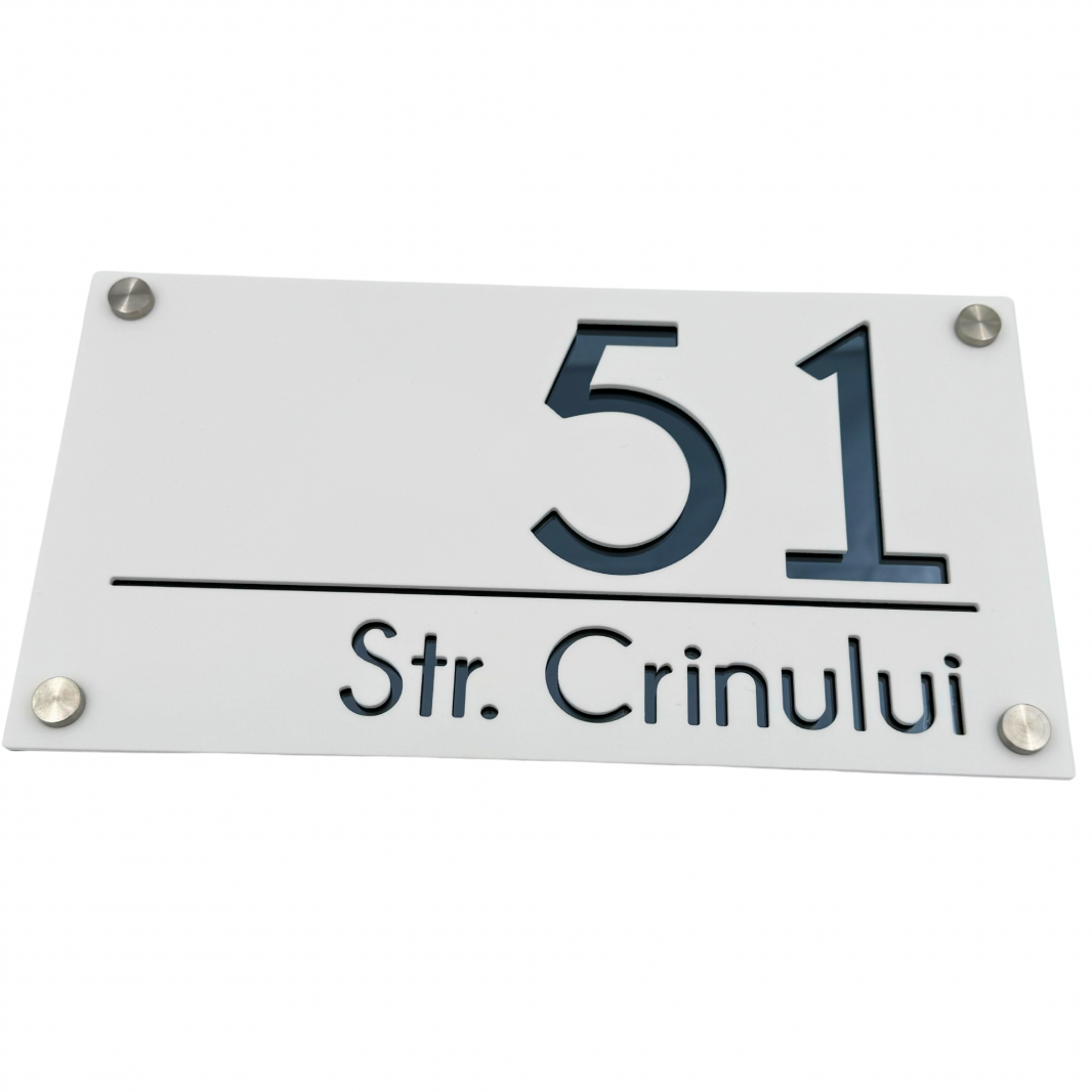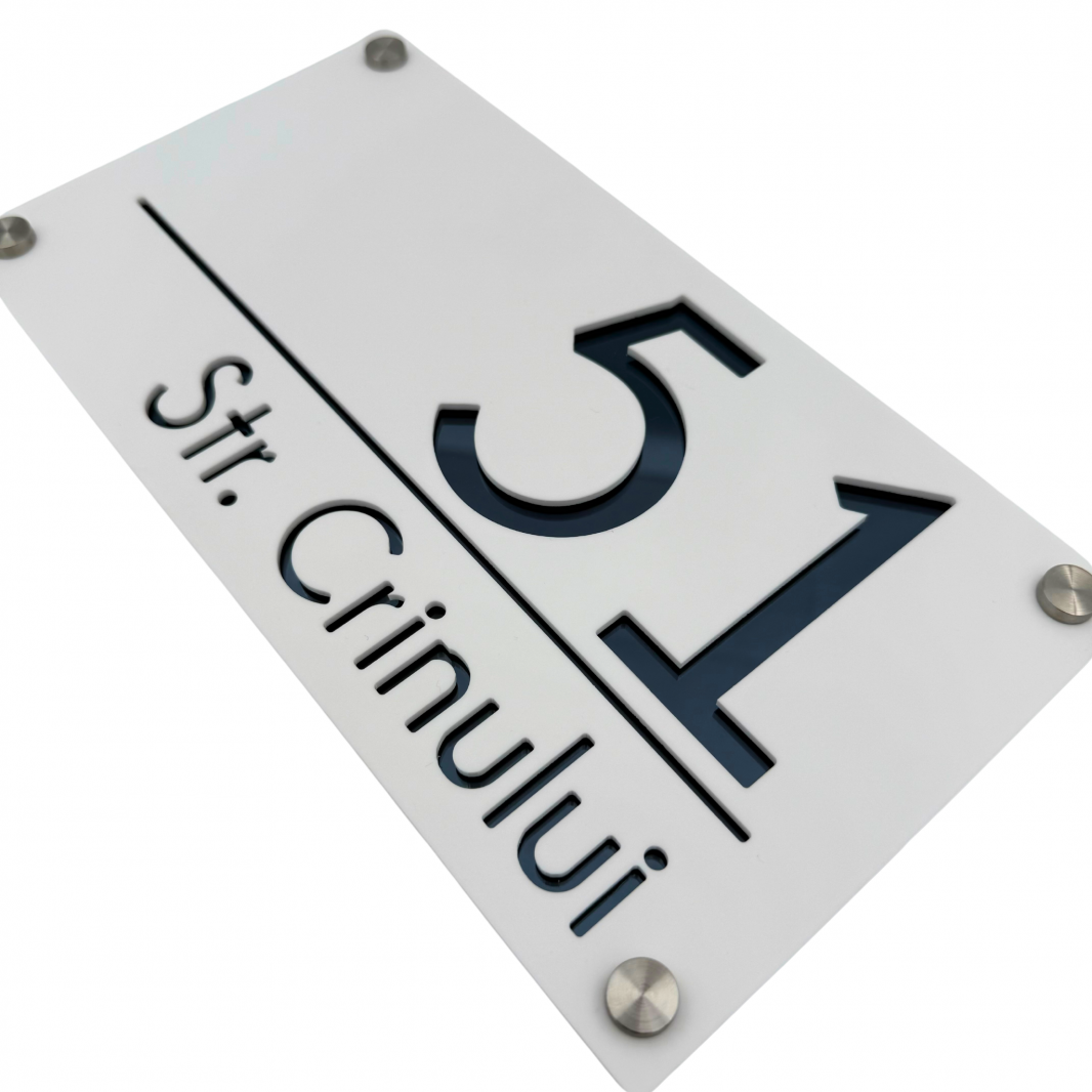 Plăcuța noastră luxoasă și extravagantă este realizată din plexiglas de cea mai înaltă calitate, cu o grosime de 6 mm, pentru a vă oferi o durabilitate și rezistență de neegalat. Fiecare număr și adresă sunt gravate cu precizie și atenție, pentru a crea un efect vizual impresionant și sofisticat.