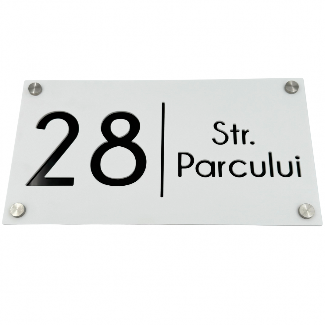 Plăcuța noastră luxoasă și extravagantă este realizată din plexiglas de cea mai înaltă calitate, cu o grosime de 6 mm, pentru a vă oferi o durabilitate și rezistență de neegalat. Fiecare număr și adresă sunt gravate cu precizie și atenție, pentru a crea un efect vizual impresionant și sofisticat.