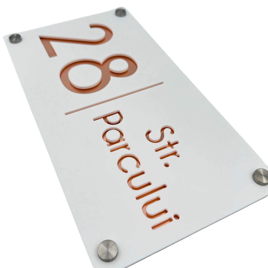 Plăcuța noastră luxoasă și extravagantă este realizată din plexiglas de cea mai înaltă calitate, cu o grosime de 6 mm, pentru a vă oferi o durabilitate și rezistență de neegalat. Fiecare număr și adresă sunt gravate cu precizie și atenție, pentru a crea un efect vizual impresionant și sofisticat.