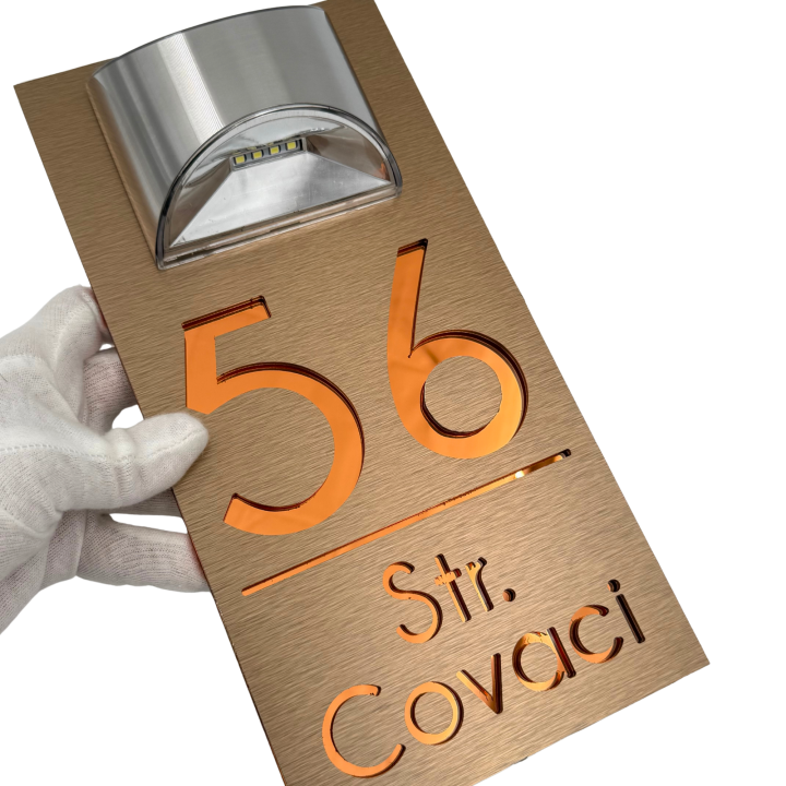 NUMAR CASA PREMIUM - Aluminiu Periat Bronz / Cupru Oglinda / Lampa Solara - 30x15cm