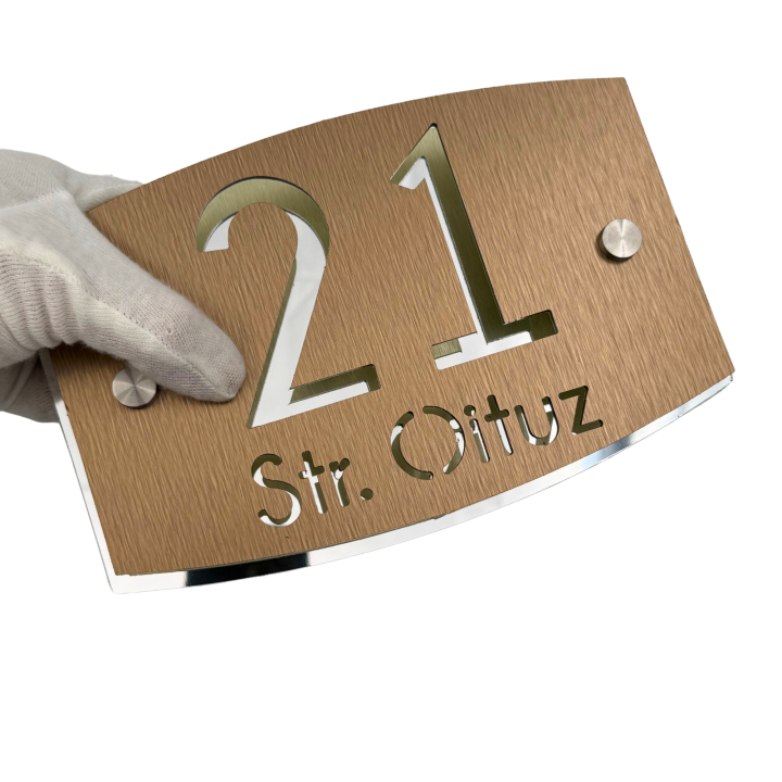 NUMAR CASA PREMIUM - Aluminiu Periat Bronze / Aluminiu Argintiu Oglinda / 2 Distantieri Argintii - 20x13cm