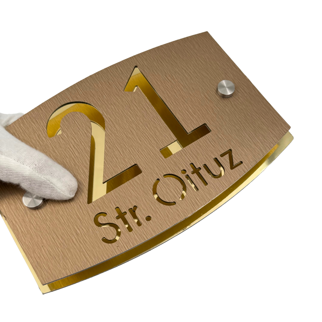 NUMAR CASA PREMIUM - Aluminiu Periat Bronze / Aluminiu Auriu Oglinda / 2 Distantieri Argintii - 20x13cm