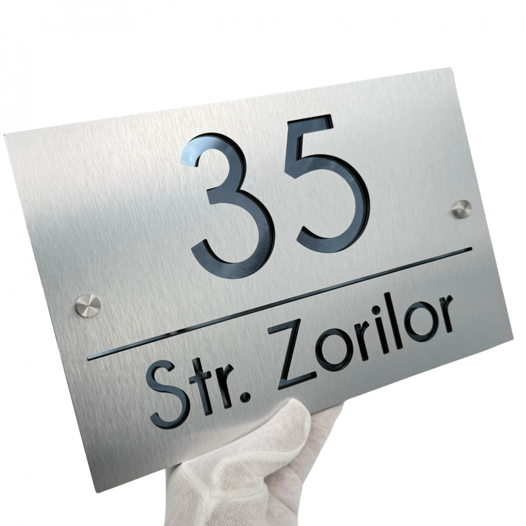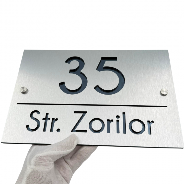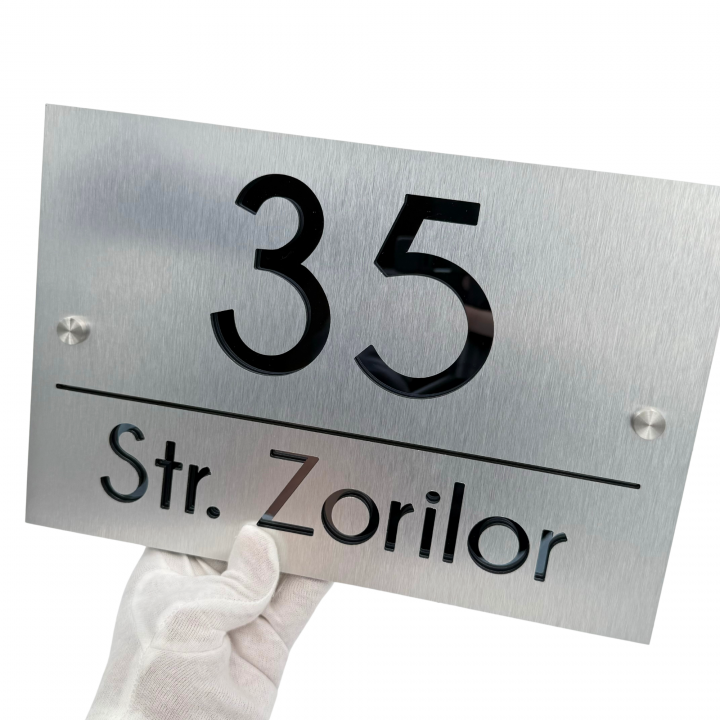Plăcuța noastră luxoasă și extravagantă este realizată din plexiglas de cea mai înaltă calitate, cu o grosime de 6 mm, pentru a vă oferi o durabilitate și rezistență de neegalat. Fiecare număr și adresă sunt gravate cu precizie și atenție, pentru a crea un efect vizual impresionant și sofisticat.