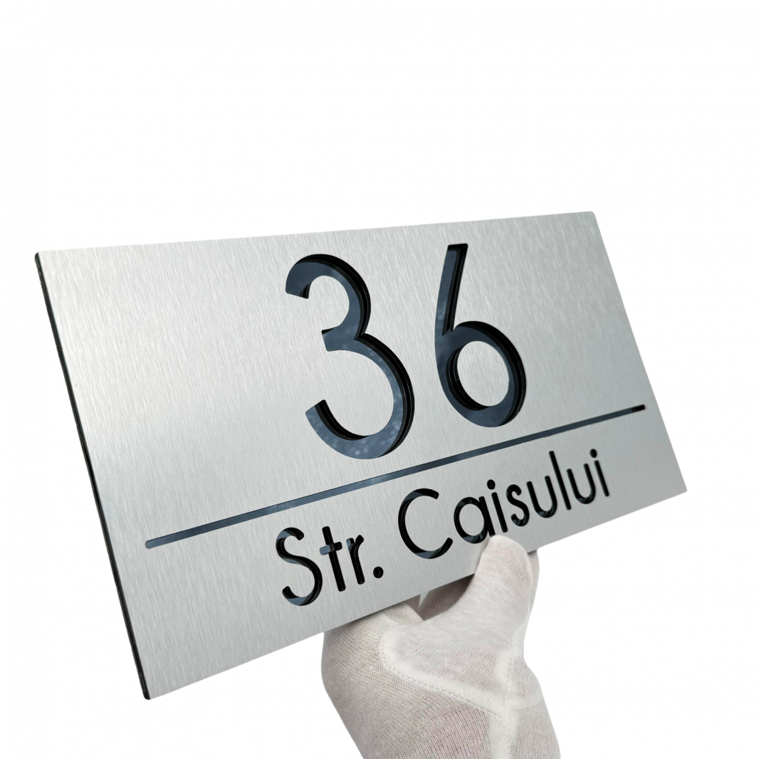 Plăcuța noastră luxoasă și extravagantă este realizată din plexiglas de cea mai înaltă calitate, cu o grosime de 6 mm, pentru a vă oferi o durabilitate și rezistență de neegalat. Fiecare număr și adresă sunt gravate cu precizie și atenție, pentru a crea un efect vizual impresionant și sofisticat.