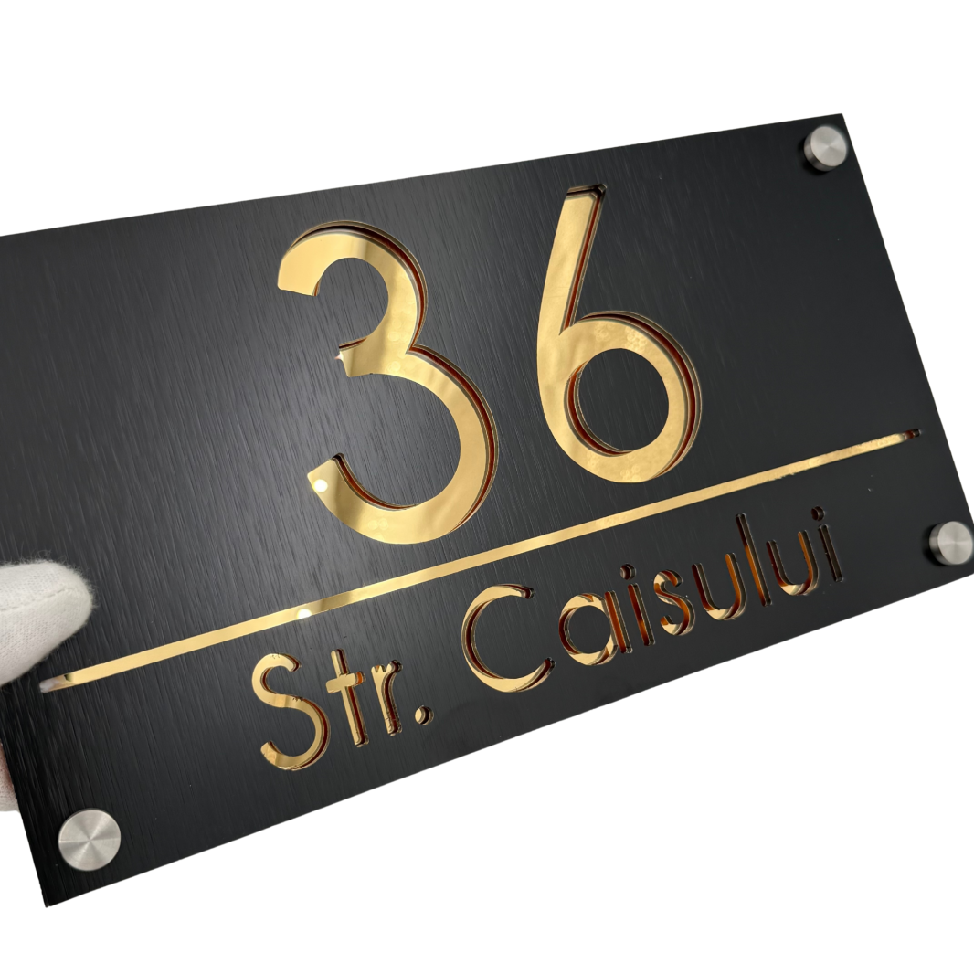 NUMAR CASA PREMIUM - Aluminiu Periat Negru / Auriu Oglinda / 4 Distantieri Argintii - 28x15cm