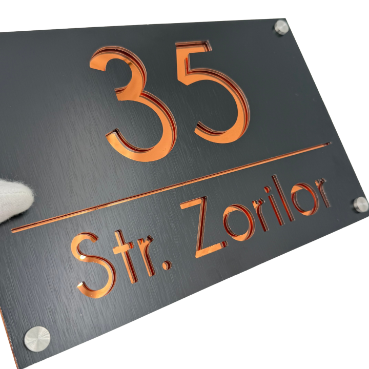 NUMAR CASA PREMIUM - Aluminiu Periat Negru / Cupru Oglinda / 4 Distantieri Argintii - 30x20cm