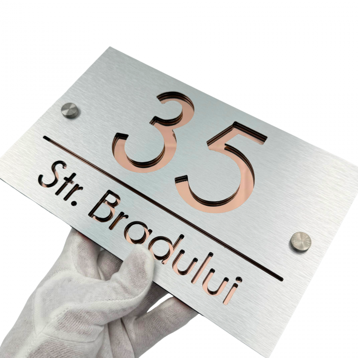Alegeți plăcuța noastră deosebită pentru număr și adresă și transformați casa sau gardul dumneavoastră într-o adevărată operă de artă. Cu un design luxos și extravagant, această piesă va adăuga un plus de valoare și stil locuinței dumneavoastră, reflectând gustul și personalitatea dumneavoastră excepțională.