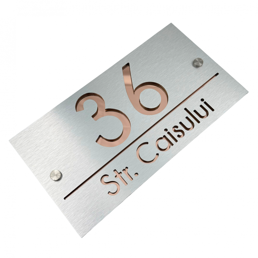 NUMAR CASA PREMIUM - Aluminiu Periat / Roze Auriu Oglinda / 2 Distantieri Argintii - 28x15cm