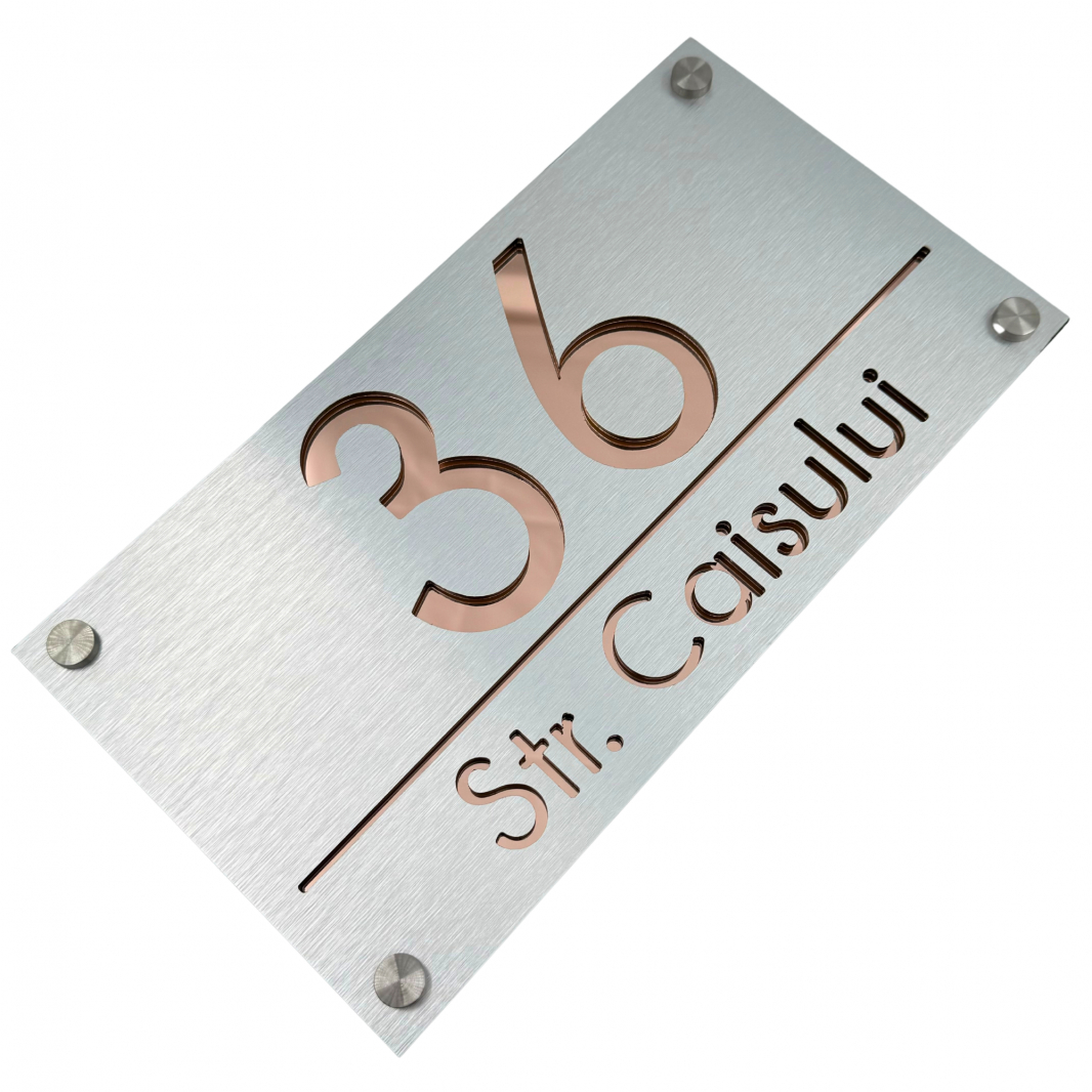 NUMAR CASA PREMIUM - Aluminiu Periat / Roze Auriu Oglinda / 4 Distantieri Argintii - 28x15cm