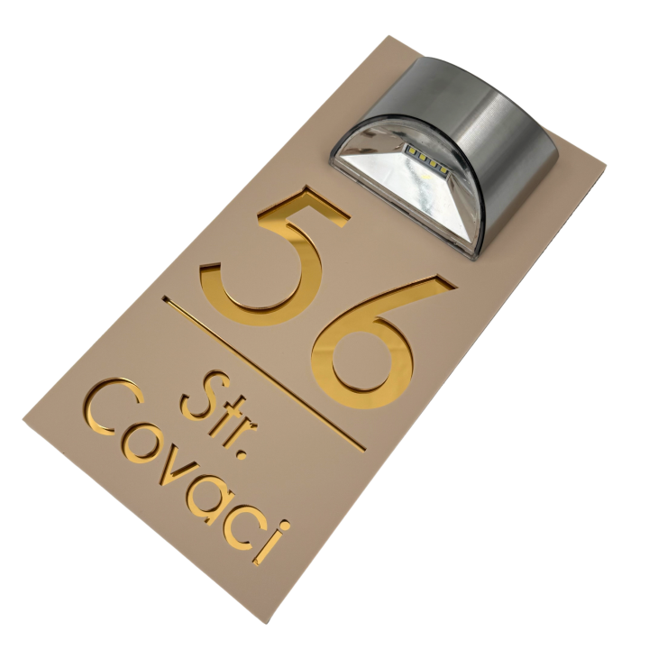 NUMAR CASA PREMIUM - Crem Satinat / Auriu Oglinda / Lampa Solara - 30x15cm