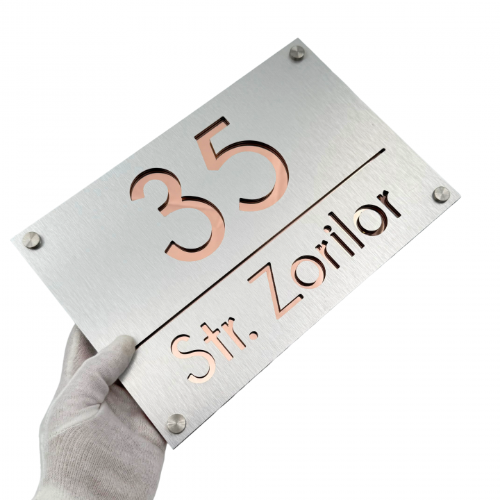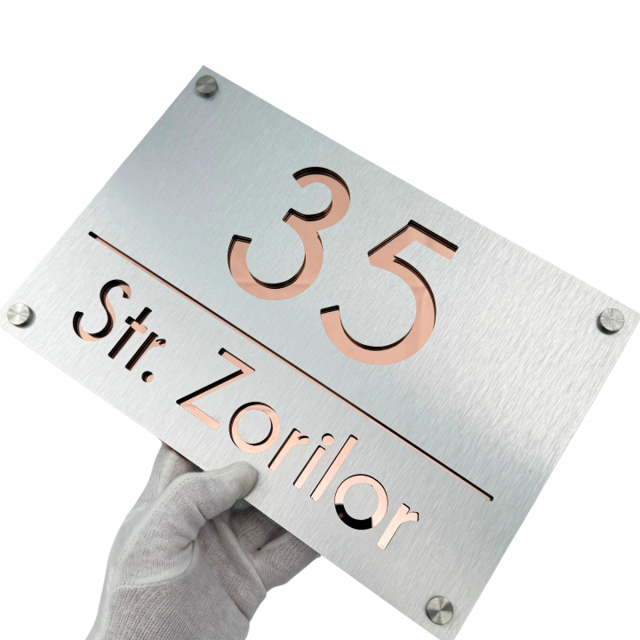 Alegeți plăcuța noastră deosebită pentru număr și adresă și transformați casa sau gardul dumneavoastră într-o adevărată operă de artă. Cu un design luxos și extravagant, această piesă va adăuga un plus de valoare și stil locuinței dumneavoastră, reflectând gustul și personalitatea dumneavoastră excepțională.
