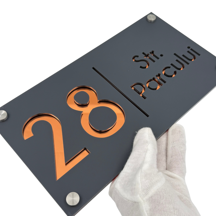 Plăcuța noastră luxoasă și extravagantă este realizată din plexiglas de cea mai înaltă calitate, cu o grosime de 6 mm, pentru a vă oferi o durabilitate și rezistență de neegalat. Fiecare număr și adresă sunt gravate cu precizie și atenție, pentru a crea un efect vizual impresionant și sofisticat.