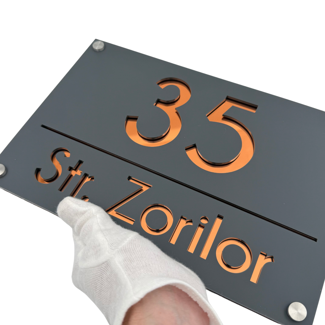 NUMAR CASA PREMIUM - Gri Satinat / Cupru Oglinda / 4 Distantieri Argintii - 30x20cm