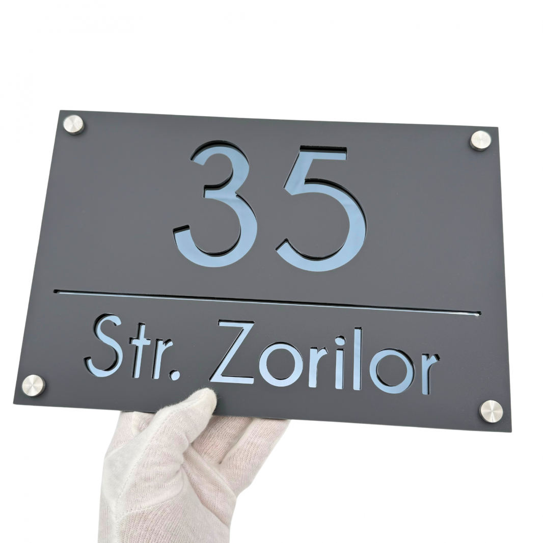 Plăcuța noastră luxoasă și extravagantă este realizată din plexiglas de cea mai înaltă calitate, cu o grosime de 6 mm, pentru a vă oferi o durabilitate și rezistență de neegalat. Fiecare număr și adresă sunt gravate cu precizie și atenție, pentru a crea un efect vizual impresionant și sofisticat.