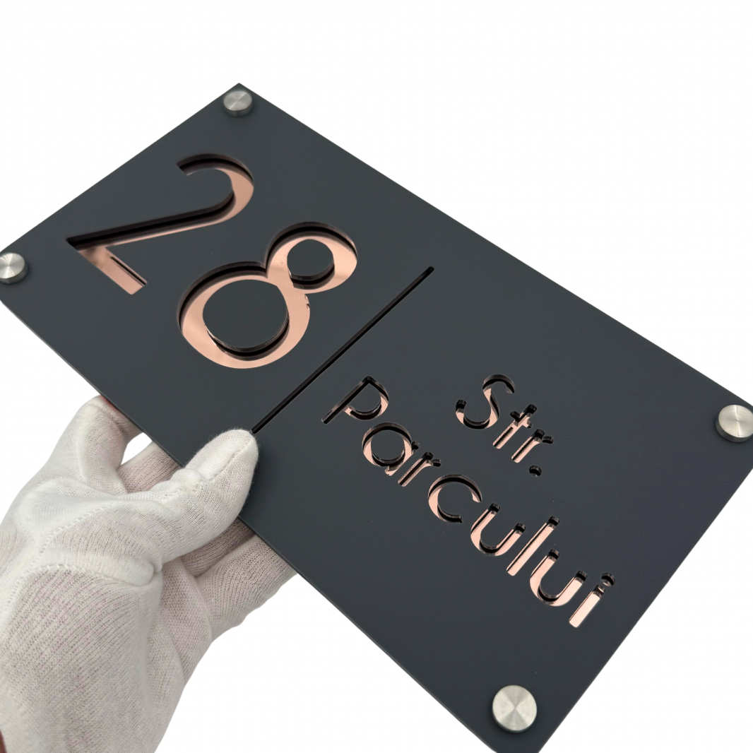 Alegeți plăcuța noastră deosebită pentru număr și adresă și transformați casa sau gardul dumneavoastră într-o adevărată operă de artă. Cu un design luxos și extravagant, această piesă va adăuga un plus de valoare și stil locuinței dumneavoastră, reflectând gustul și personalitatea dumneavoastră excepțională.