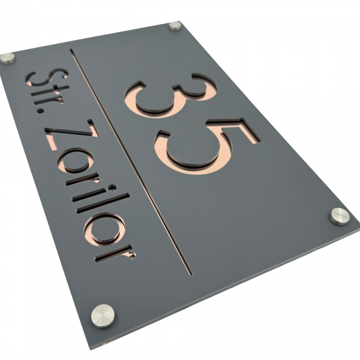 Plăcuța noastră luxoasă și extravagantă este realizată din plexiglas de cea mai înaltă calitate, cu o grosime de 6 mm, pentru a vă oferi o durabilitate și rezistență de neegalat. Fiecare număr și adresă sunt gravate cu precizie și atenție, pentru a crea un efect vizual impresionant și sofisticat.