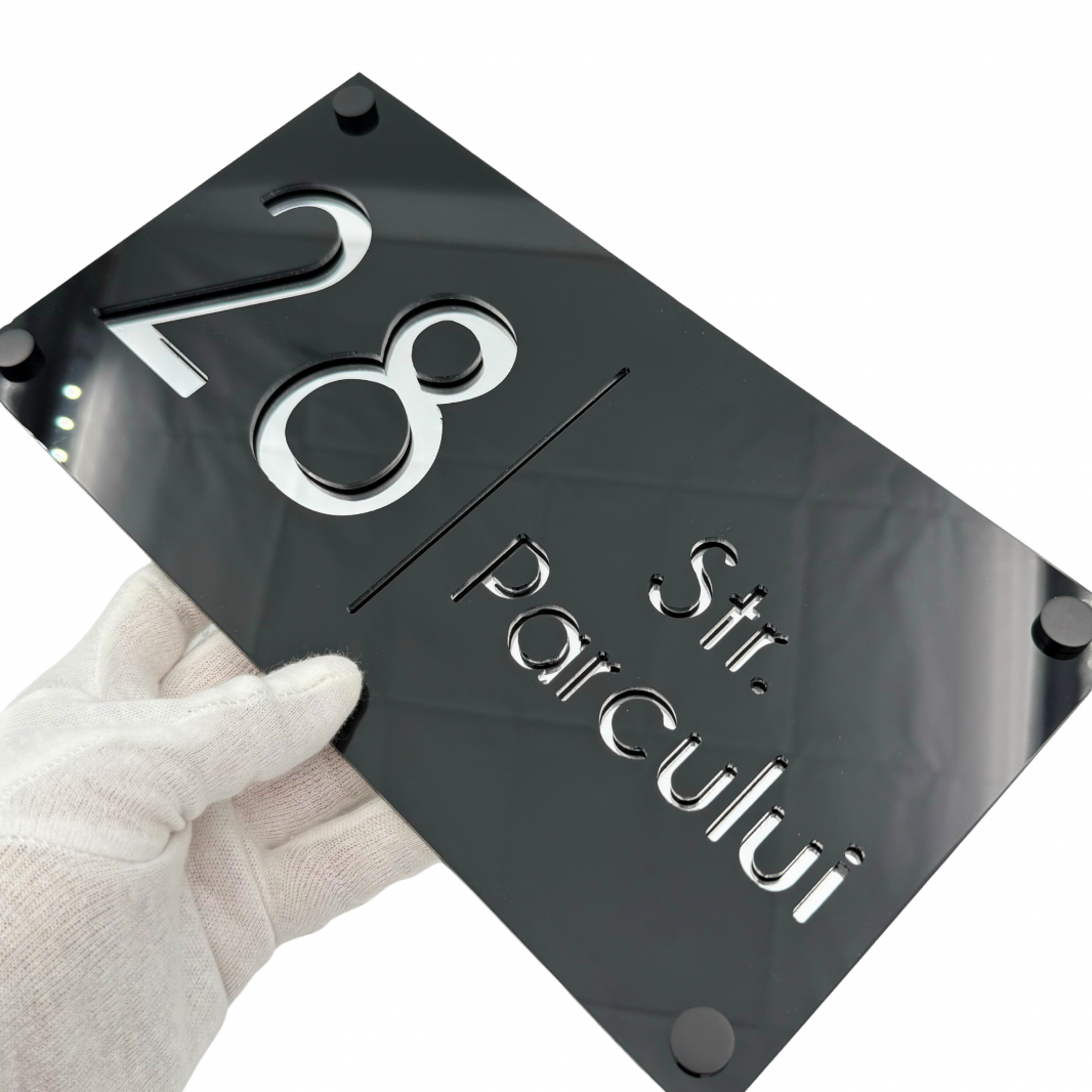 Plăcuța noastră luxoasă și extravagantă este realizată din plexiglas de cea mai înaltă calitate, cu o grosime de 6 mm, pentru a vă oferi o durabilitate și rezistență de neegalat. Fiecare număr și adresă sunt gravate cu precizie și atenție, pentru a crea un efect vizual impresionant și sofisticat.