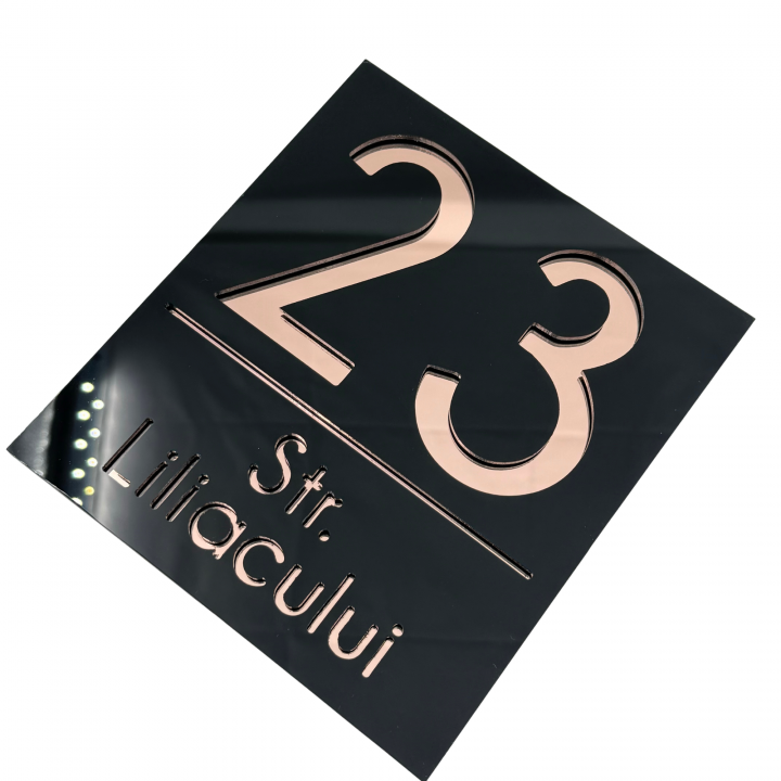 Plăcuța noastră luxoasă și extravagantă este realizată din plexiglas de cea mai înaltă calitate, cu o grosime de 6 mm, pentru a vă oferi o durabilitate și rezistență de neegalat. Fiecare număr și adresă sunt gravate cu precizie și atenție, pentru a crea un efect vizual impresionant și sofisticat.