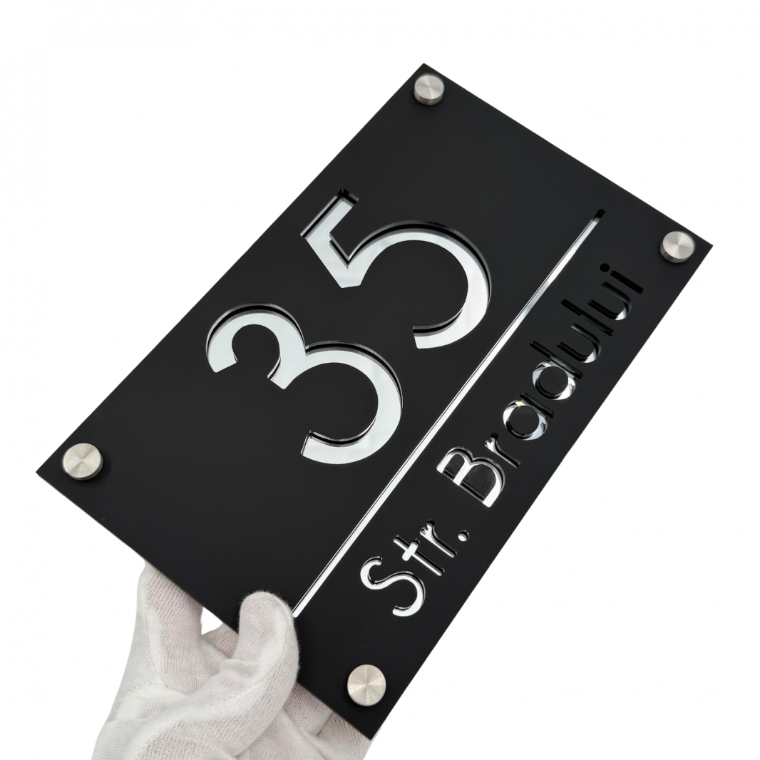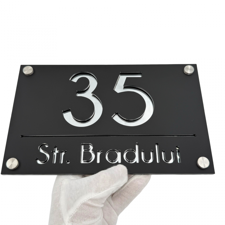 Plăcuța noastră luxoasă și extravagantă este realizată din plexiglas de cea mai înaltă calitate, cu o grosime de 6 mm, pentru a vă oferi o durabilitate și rezistență de neegalat. Fiecare număr și adresă sunt gravate cu precizie și atenție, pentru a crea un efect vizual impresionant și sofisticat.