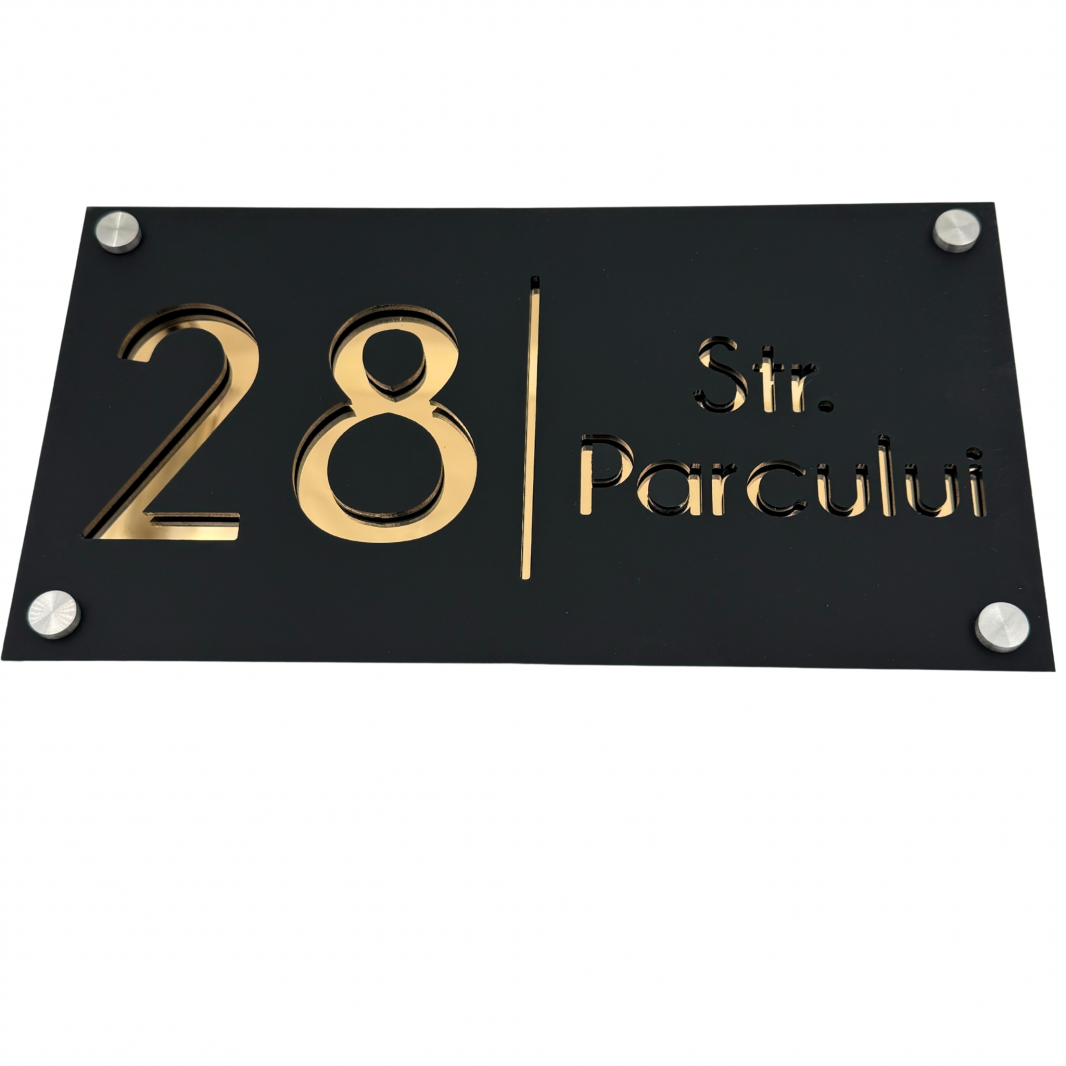 Plăcuța noastră luxoasă și extravagantă este realizată din plexiglas de cea mai înaltă calitate, cu o grosime de 6 mm, pentru a vă oferi o durabilitate și rezistență de neegalat. Fiecare număr și adresă sunt gravate cu precizie și atenție, pentru a crea un efect vizual impresionant și sofisticat.