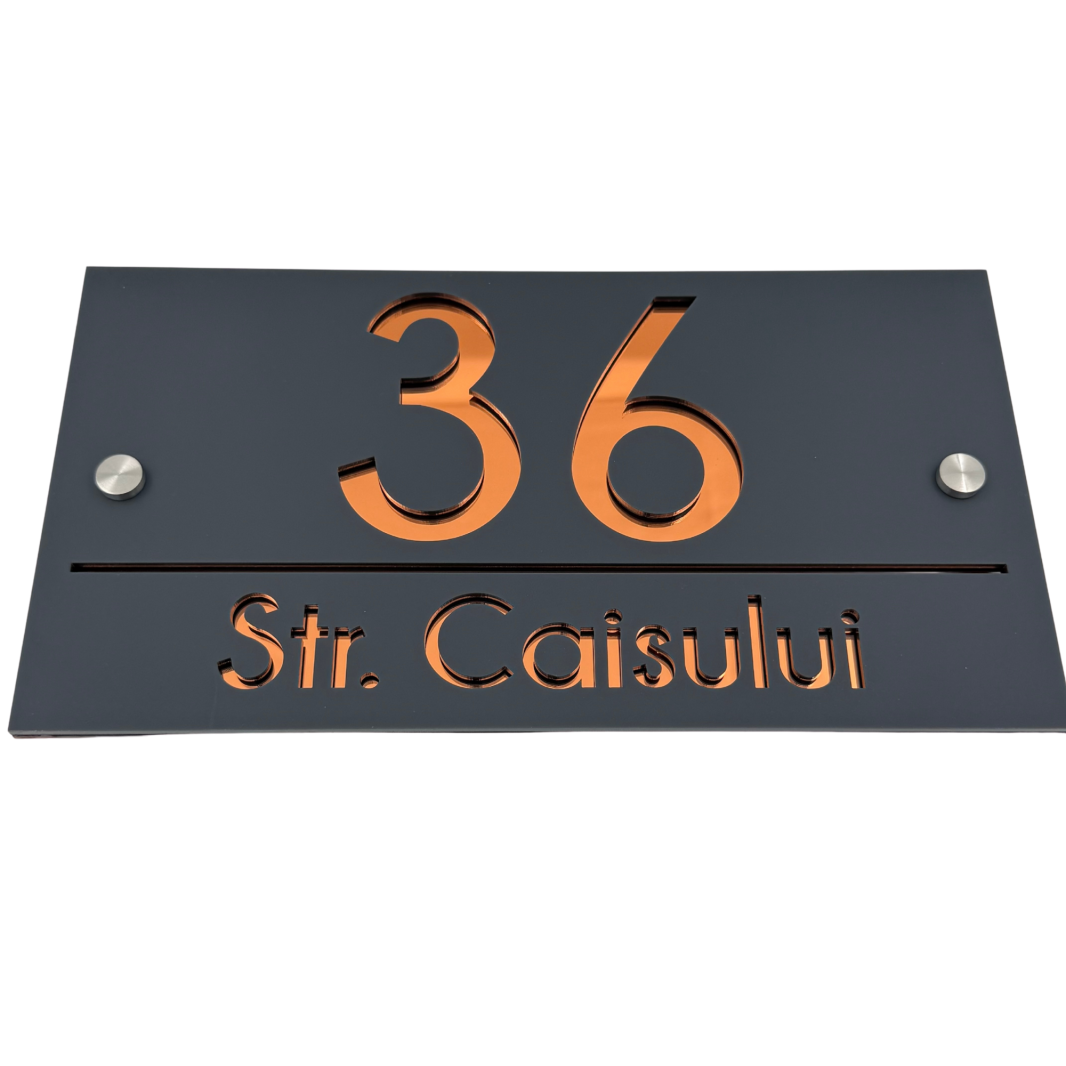 NUMAR CASA PREMIUM - Negru Satinat / Cupru Oglinda / 2 Distantieri Argintii - 28x15cm
