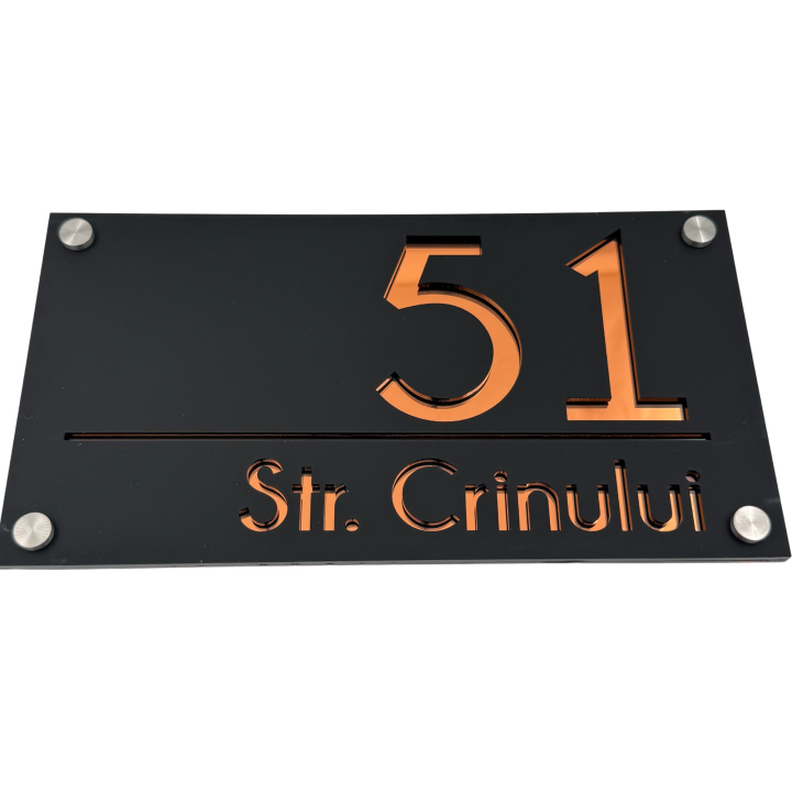 NUMAR CASA PREMIUM - Negru Satinat / Cupru Oglinda / 4 Distantieri Argintii - 28x15cm