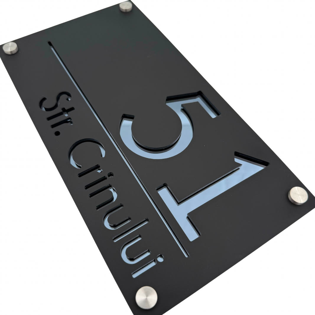 Plăcuța noastră luxoasă și extravagantă este realizată din plexiglas de cea mai înaltă calitate, cu o grosime de 6 mm, pentru a vă oferi o durabilitate și rezistență de neegalat. Fiecare număr și adresă sunt gravate cu precizie și atenție, pentru a crea un efect vizual impresionant și sofisticat.