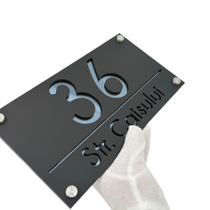 Plăcuța noastră luxoasă și extravagantă este realizată din plexiglas de cea mai înaltă calitate, cu o grosime de 6 mm, pentru a vă oferi o durabilitate și rezistență de neegalat. Fiecare număr și adresă sunt gravate cu precizie și atenție, pentru a crea un efect vizual impresionant și sofisticat.
